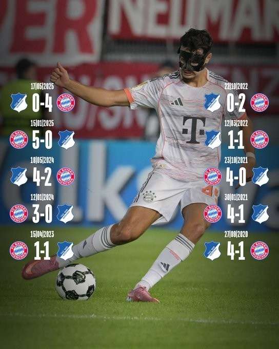 从2020年至今的交锋记录来看,拜仁在主场表现尤为强势,其中2025年的两场比赛中分别以5-0和4-0的比分完胜对手。不过霍芬海姆也曾在2020年9月和2024年5月两次让拜仁尝到失利的滋味,其中4-1和4-2的比分显示出这支球队的爆发力。