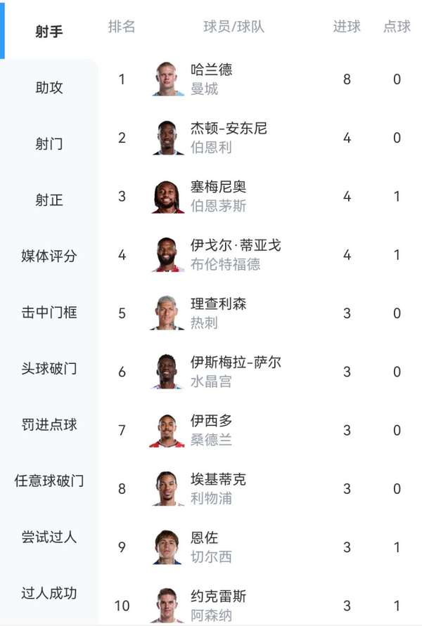 随着英超第六轮赛事接近尾声,联赛射手榜竞争格局逐渐明朗。曼城锋霸哈兰德延续恐怖效率,六轮战罢已斩获8粒进球,在射手榜上建立起明显优势。